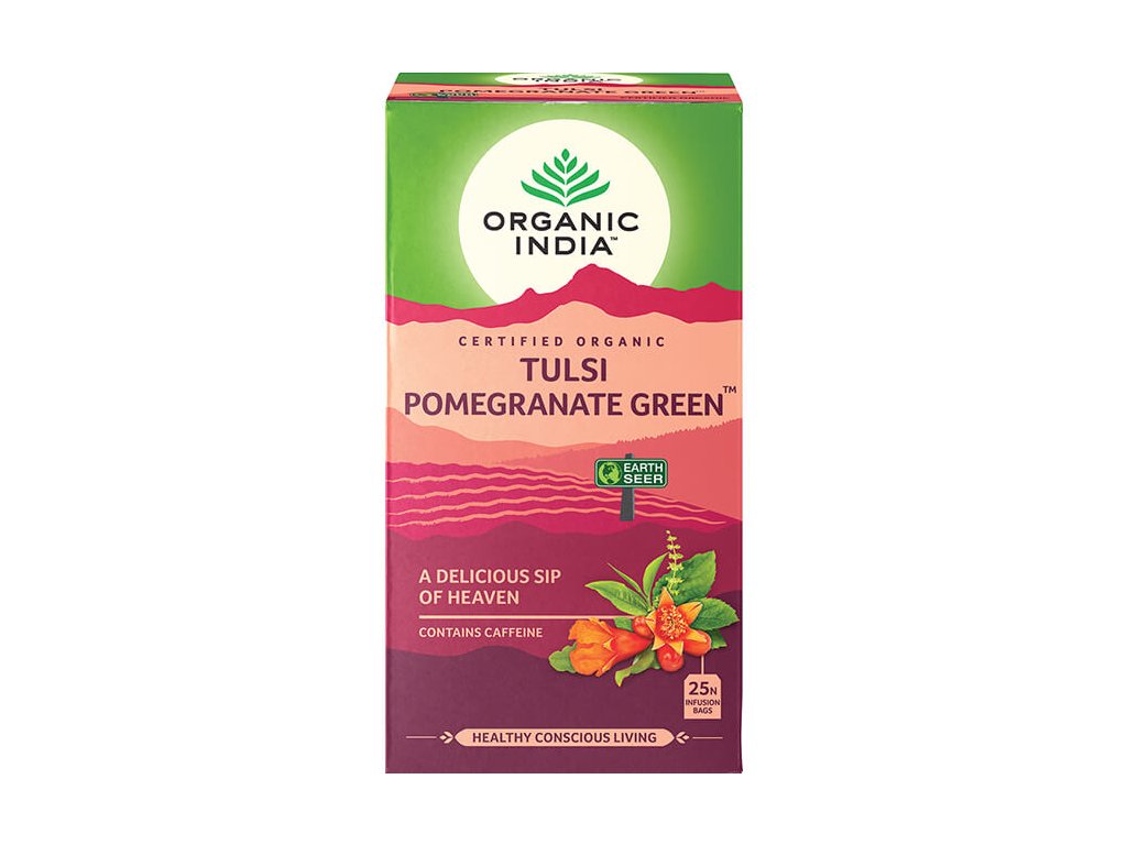 Tulsi s granátovým jablkom a zeleným čajom Ajurvédsky čaj porciovaný Organic India 25 vreciek